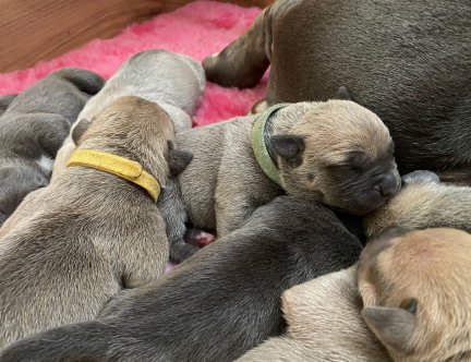 - Colors: We have 10 beautiful puppies in blue and blue fawn. They will all carry the gene for the tri-color pattern.